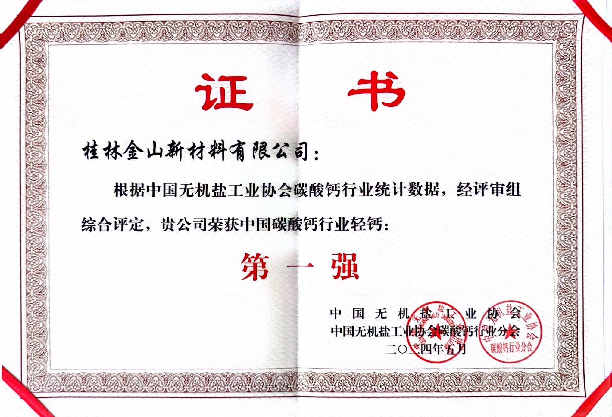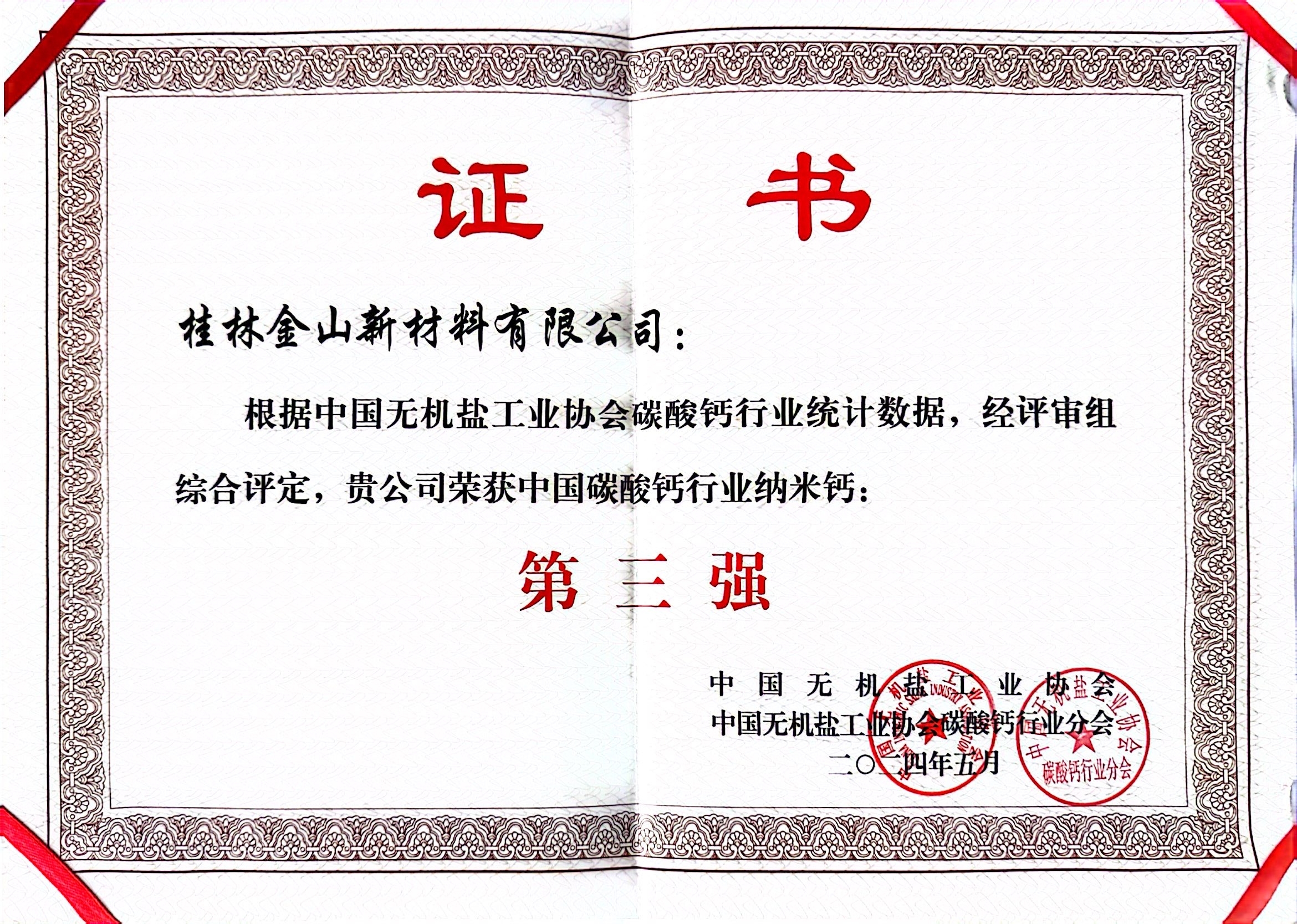 被中國(guó)無機(jī)鹽工業(yè)協(xié)會(huì)、中國(guó)無機(jī)鹽工業(yè)協(xié)會(huì)碳酸鈣行業(yè)分會(huì)授予“輕鈣第一強(qiáng)”、“納米鈣第三強(qiáng)”稱號(hào)